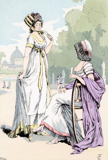| Keywords: In the Gardens of the Tuileries, Year VII - 1799.jpg Artwork This plate depicts two well-dressed women fanning themselves in a large public garden The woman in yellow wears a typically aristocratic hat more popular before the French Revolution It is high and adorned with a large silk ribbon The woman in the pink and white dress wears a cotton turban which was a style very popular in the late 18th century Simpler hats were more popular at the end of the 18th century because they were supposed to be more 'democratic' than other more elitist fashions Both women wear classical style dresses modeled after robes of ancient Greece These are also adorned with pastel colored ribbons Pastel colors became more popular after the Revolution and were thought to look more 'natural ' These dresses both show a good deal more of the woman's bodies than previous styles as demonstrated by the low cut neckline revealing the décolletage 1898 colored plate 10 x 15 cm Institution Brown University Library object history exhibition history credit line Published in Octave Uzanne Fashion in Paris the various phases of feminine taste and aesthetics from 1797 to 1897 London William Heinemann 1898 accession number 1145808208873216 PD-old Les modes de Paris 007 Images of Paris from the Brown University Library 1799 in Paris 18th-century people of Paris Fashion in 1799 Females with white dresses in art Jardin des Tuileries in art 1790s dresses |