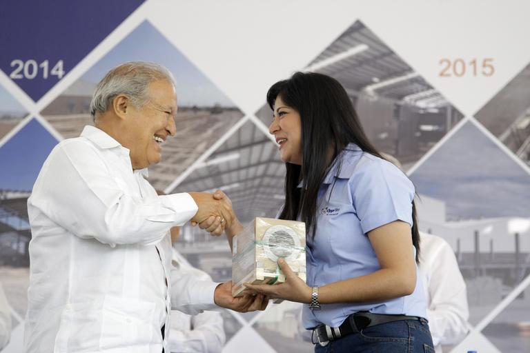 Keywords: Presidente Salvador Sánchez Cerén recibe obsequio de una empleada. Presidente Salvador Sánchez Cerén recibe obsequio de una empleada.