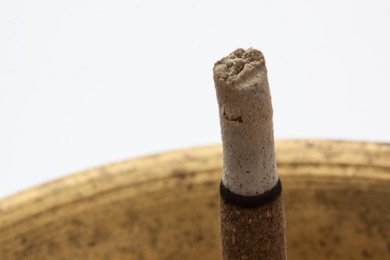 Keywords: incense cup incense chalice brass ash about burned down blend in stick form fragrance buddhism hinduism confucianism taoism ceremony meditation natural ingredients macro
