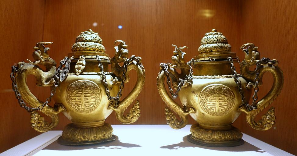 Keywords: Incensories with three-dragon handles, Tibet, 1644-1911 AD, gilt copper - Sichuan Provincial Museum - Chengdu, China - DSC04461.jpg en Exhibit in the Sichuan Provincial Museum 四 博物院 also known as the Sichuan Museum 251 Huanhua S Road Chengdu Sichuan China Photography was permitted in the museum without restriction This work is old enough so that it is in the public domain 2015-09-24 02 29 51 own Daderot other versions PD-old-100 cc-zero Metalwork of Tibet in the Sichuan Provincial Museum |