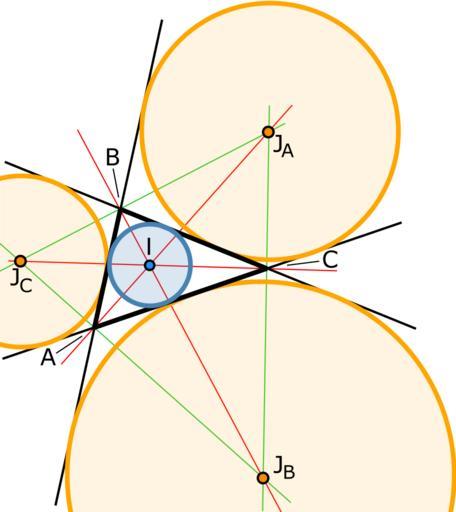 | Keywords: Incircle and Excircles.svg Diagram to shown the construction of the incenter blue I the incircle blue the excentres orange J<sub>A</sub> J<sub>B</sub> J<sub>C</sub> and the excircles orange Self-Made using Inkscape 08/05/2007 Inductiveload Incircle and excircles SVG geometry Incenter |