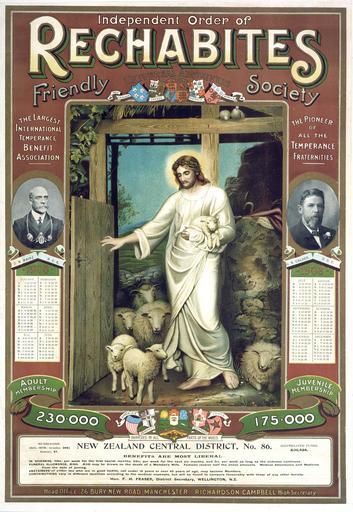 | Keywords: text Shows text arranged around a central inset of Christ leading a flock of sheep through a wooden doorway. He holds one lamb. There is a calendar for 1908 arranged on either side of this panel. Beneath are portraits of D M Main, H.C.R., and J M Calder, D.C.R. F H Fraser of Wellington is the District Secretary. Quantity: 1 colour photo-mechanical print(s) on poster.. Physical Description: Photolithograph, coloured, om sheet 558 x 377 mm. Provenance: Purchased at Dunbar Sloane auction 20th August 1998, as part of lot 422. Search dates: 1908 - 1908 Independent Order of Rechabites Friendly Society :No. 86 District. New Zealand Central. [Christ the Good Shepherd. Calendar]. 1908.. Ref: Eph-D-ALCOHOL-Temperance-1908-01. Alexander Turnbull Library, Wellington, New Zealand. natlib.govt.nz/records/22855205 Shows text arranged around a central inset of Christ leading a flock of sheep through a wooden doorway. He holds one lamb. There is a calendar for 1908 arranged on either side of this panel. Beneath are portraits of D M Main, H.C.R., and J M Calder, D.C.R. F H Fraser of Wellington is the District Secretary. Quantity: 1 colour photo-mechanical print(s) on poster.. Physical Description: Photolithograph, coloured, om sheet 558 x 377 mm. Provenance: Purchased at Dunbar Sloane auction 20th August 1998, as part of lot 422. Search dates: 1908 - 1908 Independent Order of Rechabites Friendly Society :No. 86 District. New Zealand Central. [Christ the Good Shepherd. Calendar]. 1908.. Ref: Eph-D-ALCOHOL-Temperance-1908-01. Alexander Turnbull Library, Wellington, New Zealand. natlib.govt.nz/records/22855205 |