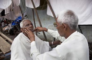 Keywords: india man people male shave parlour