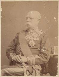 | Keywords: Indian Celebrities- Sir Donald Stewart WDL11439.png Artwork ru Индийские знаменитости Сэ Дональд Стюа т fr Personnages célèbres de l'Inde sir Donald Stewart en Indian Celebrities Sir Donald Stewart zh 印度名人:唐纳德·斯图尔特爵士 pt Celebridades indianas Sir Donald Stewart ar مشاهير هُنود السير دونالد ستيوارت ru Этот по т ет сэ а Дональда Стюа та 1824 1900 гг изоб аженного в пово оте т и четве ти входит в альбом едких исто ических фотоснимков на кото ых изоб ажены люди и места связанные со Вто ой англо-афганской войной В октяб е 1878 года Стюа т командовал Кандага ской полевой а мией также известной как а мия Кветты кото ая сове шив тяжелый пе еход че ез т удноп оходимую местность и п иняв участие в нескольких кавале ийских с ажениях п отив афганских войск в янва е 1879 года успешно заняла Кандага В ап еле 1881 года он был назначен главнокомандующим б итанскими войсками в Индии а в 1894 году получил звание фельдма шала а данном снимке он изоб ажен в фо ме гене ал-лейтенанта В пе иод б итанского господства 1858 1947 годов выдающихся б итанских должностных лиц и военнослужащих часто называли индийскими знаменитостями Вто ая англо-афганская война началась в нояб е 1878 года когда Великоб итания опасаясь как ей казалось астущего влияния России в Афганистане вто глась в эту ст ану с те ито ии Б итанской Индии Пе вый этап войны закончился в мае 1879 года подписанием Гандамакского догово а позволившего афганцам сох анить внут енний суве енитет однако заставившего их уступить конт оль над внешней политикой своей ст аны б итанцам Военные действия возобновились в сентяб е 1879 года после антиб итанского восстания в Кабуле и окончательно заве шились в сентяб е 1880 года ешающей битвой за Кандага Данный альбом включает по т еты б итанских и афганских лиде ов и военнослужащих фотог афии п остых афганских людей изоб ажения б итанских военных лаге ей военных действий ст оений пейзажей к упных и небольших го одов Все изоб аженные на фотоснимках места находятся на те ито ии сов еменных Афганистана или Пакистана в то в емя бывших частью Б итанской Индии Около т ети п едставленных в альбоме фотог афий выполнены Джоном Бе ком около 1843 1900 гг д угая т еть сэ ом Бенджамином Симпсоном 1831 1923 гг а оставшаяся часть несколькими д угими фотог афами Авто ы некото ых фотоснимков неизвестны Возможно что составителем альбома был один из членов б итанского п авительства в Индии однако это п едположение не подтве ждено Каким об азом альбом попал в Библиотеку Конг есса неизвестно <br>Афганские войны; Офице ы; Военная фо ма; По т етные фотог афии; По т еты; Стюа т Дональд а тин 1824 1900 гг fr Ce portrait de trois quarts de sir Donald Stewart 1824 1900 est extrait d'un album de photographies historiques rares de personnalités et de sites associés à la seconde guerre anglo-afghane Stewart fut commandant de la Force de campagne de Kandahar également appelée l'armée de Quetta en octobre 1878 et après une marche pénible à travers un terrain rude et plusieurs batailles de cavalerie contre les forces afghanes il parvint à occuper Kandahar en janvier 1879 Il fut promu commandant en chef en Inde en avril 1881 et maréchal en 1894 Il est photographié ici portant l'uniforme de général de corps d'armée Pendant le Raj britannique de 1858 à 1947 les militaires et les administrateurs coloniaux de haut rang étaient souvent considérés comme des célébrités « indiennes » La seconde guerre anglo-afghane commença en novembre 1878 lorsque la Grande-Bretagne se sentant menacée par l'influence croissante des Russes en Afghanistan envahit le pays depuis l'Inde britannique La première phase de la guerre s'acheva en 1879 avec le traité de Gandamak qui permit aux Afghans de conserver leur souveraineté nationale mais les força à céder le contrôle de leur politique étrangère aux Britanniques Les combats reprirent en septembre 1879 à la suite d'un soulèvement antibritannique à Kaboul et ils se conclurent finalement en septembre 1880 avec la bataille décisive de Kandahar L'album contient des portraits de dirigeants et de militaires britanniques et 