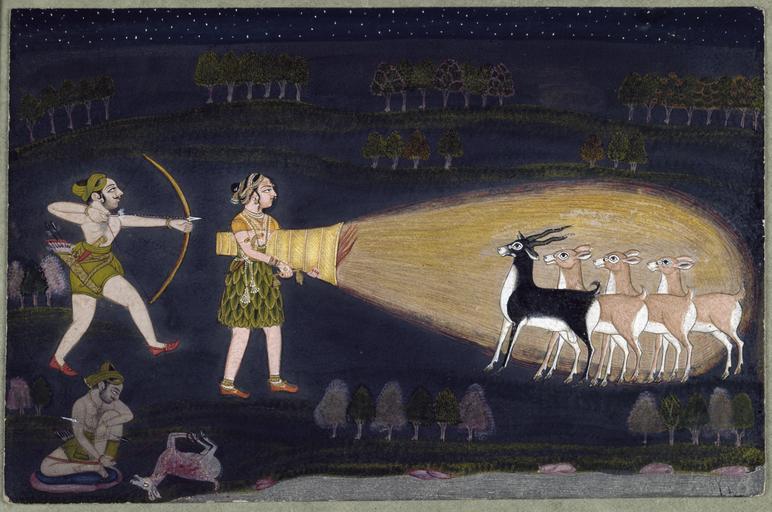 Keywords: Indian - A Deer Hunt - Walters W854.jpg A woman with a giant torch mesmerizes a deer She may not be a member of the Bhil tribe though her skirt resembles a Bhil skirt but a lady of the court indulging in a nocturnal adventure This must have been a memorable event with its own special mood which the court artist was asked to preserve ca 1775 pigments paper cm 16 8 25 6 accession number W 854 1398 Jegdish Mittal Hyderabad India date and mode of acquisition unknown John and Berthe Ford Baltimore date and mode of acquisition unknown Walters Art Museum John Berthe Ford 2000 place of origin Kotah Rajasthan India Walters Art Museum license 2D Paintings of India in the Walters Art Museum Bhil people 1770s paintings from India Hunting in art of India |