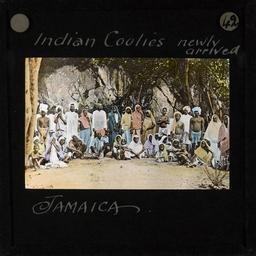 Keywords: Indian Migrant Workers, Jamaica, ca.1875-ca.1940 (imp-cswc-GB-237-CSWC47-LS11-042).jpg en <br> Indian Migrant Workers Jamaica ca 1875-ca 1940 Indian Coolies newly arrived Photograph of a group of Indian workers having newly arrived in Jamaica The group consists of men women and children They are gathered in a clearing and there are trees visible behind them The term Coolie is a historical word used to describe manual labourers from Asia particularly China and India in the 19th century and early 20th century Between 1838 and 1917 many thousands of Indian workers were brought to Jamaica ; This belongs to a series of Church of Scotland Foreign Missions Committee lantern slides relating to Jamaica In 1800 the Scottish Missionary Society sent three missionaries to Jamaica Two died of yellow fever within weeks of arrival but the third became a pioneer missionary In 1824 a second venture travelled to Jamaica by invitation of local planters to instruct their slaves Scottish missionaries worked at Montego Bay in the 19th century and in 1836 the first presbytery of the Jamaican Church was constituted here Photographer Unknown Filename imp-cswc-GB-237-CSWC47-LS11-042 tif Coverage date circa 1875/1940 Part of collection International Mission Photography Archive ca 1860-ca 1960 Type images Part of subcollection Photographs from the Centre for the Study of World Christianity University of Edinburgh U K ca 1900-ca 1940s Repository name Centre for the Study of World Christianity Archival file impaunpub_Volume7/1816 url Repository address The University of Edinburgh School of Divinity New College Mound Place Edinburgh EH1 2LX United Kingdom Geographic subject country Jamaica; India Format aacr2 1 lantern slide 8 x 8 cm Geographic subject continent North and Central America Rights Contact the repository for details Part of series Jamaica LS11 Repository email divinity-CSWC ed ac uk Subject lcsh Keyword Manual work; Migrant labor; Children Date created circa 1875/1940 Publisher of the digital version University of Southern California Libraries Subject aat genre group portrait Format aat lantern slides Legacy record ID impa-m69395 Access conditions http //www ed ac uk/schools-departments/divinity/research/centres/world-christianity/collections-resources File GB 237 CSWC47/LS11/42 circa 1875 /1940 author http //digitallibrary usc edu/cdm/ref/collection/p15799coll123/id/64934 PD-old-70-1923 Magic lantern images Images from USC Digital Library uploaded by Fæ International Mission Photography Archive ca 1860-ca 1960 People of India People of Jamaica