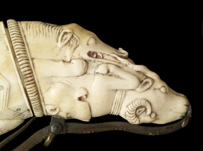 Keywords: Indian - Powder Flask - Walters 71419 - Detail A.jpg The powder flask also known as a priming flask was an essential firearm accessory and held the fine powder needed to make the gun fire Gunmakers in India during the Mughal era 1526-1858 specialized in carving ivory powder flasks with animal figures Often as these two examples the decoration consists of intertwined and composite creatures that seem to grow out of or attack one another One such menagerie on the right-hand flask includes a cheetah or lion chasing an antelope in the center and bucks antelopes lions birds a boar elephant and mongoose at the two ends Many of these animals were regularly hunted or used for hunts as with the elephant in Mughal India century 18 Early Modern ivory set with amber steel cm 6 2 16 2 2 5 accession number 71 419 40388 Max and Maurice Rosenheim date and mode of acquisition unknown Sale Sotheby's London May 9-11 1923 lot 304 Henry Walters Baltimore 1923 mode of acquisition unknown Walters Art Museum Henry Walters Acquired by Henry Walters 1923 place of origin India Walters Art Museum license Weapons in the Walters Art Museum Indian gunpowder flasks 18th-century ivory Mughal art in the Walters Art Museum Carved ivory objects Ivory sculptures in India |