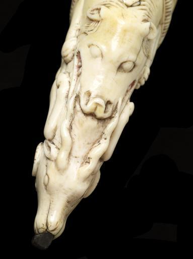 Keywords: Indian - Powder Flask - Walters 71419 - Detail B.jpg The powder flask also known as a priming flask was an essential firearm accessory and held the fine powder needed to make the gun fire Gunmakers in India during the Mughal era 1526-1858 specialized in carving ivory powder flasks with animal figures Often as these two examples the decoration consists of intertwined and composite creatures that seem to grow out of or attack one another One such menagerie on the right-hand flask includes a cheetah or lion chasing an antelope in the center and bucks antelopes lions birds a boar elephant and mongoose at the two ends Many of these animals were regularly hunted or used for hunts as with the elephant in Mughal India century 18 Early Modern ivory set with amber steel cm 6 2 16 2 2 5 accession number 71 419 40388 Max and Maurice Rosenheim date and mode of acquisition unknown Sale Sotheby's London May 9-11 1923 lot 304 Henry Walters Baltimore 1923 mode of acquisition unknown Walters Art Museum Henry Walters Acquired by Henry Walters 1923 place of origin India Walters Art Museum license Weapons in the Walters Art Museum Indian gunpowder flasks 18th-century ivory Mughal art in the Walters Art Museum Media contributed by the Walters Art Museum needs category review |
