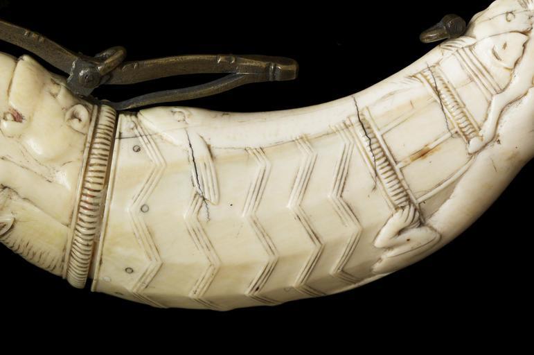 Keywords: Indian - Powder Flask - Walters 71419 - Detail C.jpg The powder flask also known as a priming flask was an essential firearm accessory and held the fine powder needed to make the gun fire Gunmakers in India during the Mughal era 1526-1858 specialized in carving ivory powder flasks with animal figures Often as these two examples the decoration consists of intertwined and composite creatures that seem to grow out of or attack one another One such menagerie on the right-hand flask includes a cheetah or lion chasing an antelope in the center and bucks antelopes lions birds a boar elephant and mongoose at the two ends Many of these animals were regularly hunted or used for hunts as with the elephant in Mughal India century 18 Early Modern ivory set with amber steel cm 6 2 16 2 2 5 accession number 71 419 40388 Max and Maurice Rosenheim date and mode of acquisition unknown Sale Sotheby's London May 9-11 1923 lot 304 Henry Walters Baltimore 1923 mode of acquisition unknown Walters Art Museum Henry Walters Acquired by Henry Walters 1923 place of origin India Walters Art Museum license Weapons in the Walters Art Museum Indian gunpowder flasks 18th-century ivory Mughal art in the Walters Art Museum Media contributed by the Walters Art Museum needs category review |