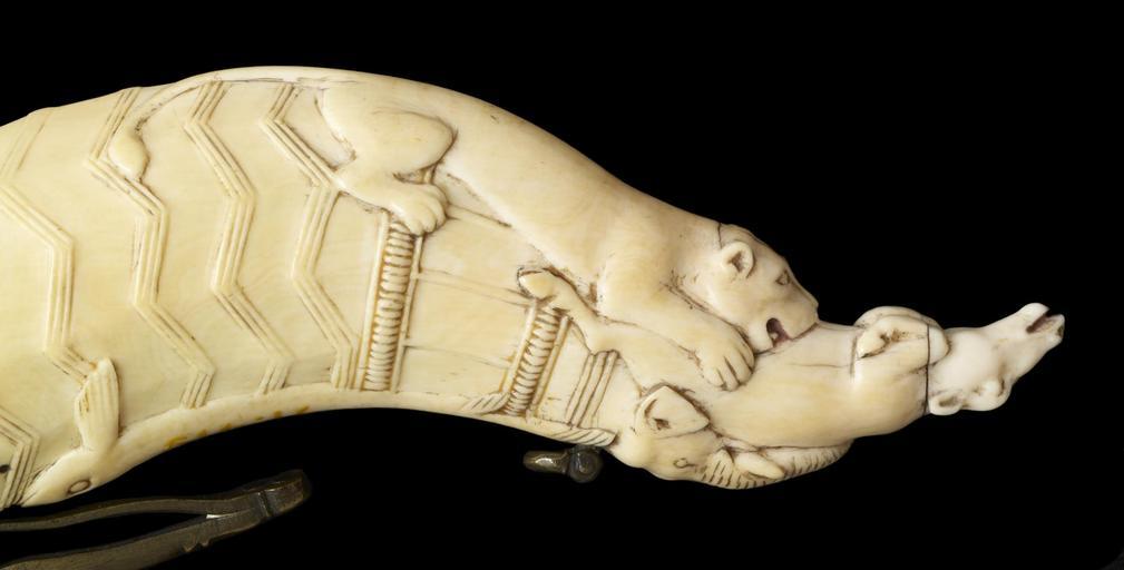 Keywords: Indian - Powder Flask - Walters 71419 - Detail D.jpg The powder flask also known as a priming flask was an essential firearm accessory and held the fine powder needed to make the gun fire Gunmakers in India during the Mughal era 1526-1858 specialized in carving ivory powder flasks with animal figures Often as these two examples the decoration consists of intertwined and composite creatures that seem to grow out of or attack one another One such menagerie on the right-hand flask includes a cheetah or lion chasing an antelope in the center and bucks antelopes lions birds a boar elephant and mongoose at the two ends Many of these animals were regularly hunted or used for hunts as with the elephant in Mughal India century 18 Early Modern ivory set with amber steel cm 6 2 16 2 2 5 accession number 71 419 40388 Max and Maurice Rosenheim date and mode of acquisition unknown Sale Sotheby's London May 9-11 1923 lot 304 Henry Walters Baltimore 1923 mode of acquisition unknown Walters Art Museum Henry Walters Acquired by Henry Walters 1923 place of origin India Walters Art Museum license Weapons in the Walters Art Museum Indian gunpowder flasks Mughal art in the Walters Art Museum Media contributed by the Walters Art Museum needs category review |