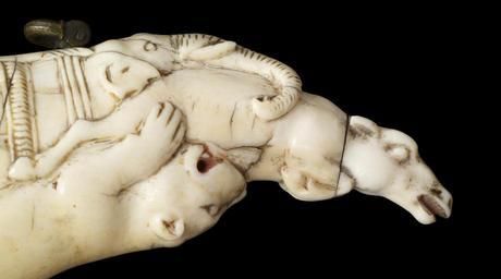 Keywords: Indian - Powder Flask - Walters 71419 - Detail E.jpg The powder flask also known as a priming flask was an essential firearm accessory and held the fine powder needed to make the gun fire Gunmakers in India during the Mughal era 1526-1858 specialized in carving ivory powder flasks with animal figures Often as these two examples the decoration consists of intertwined and composite creatures that seem to grow out of or attack one another One such menagerie on the right-hand flask includes a cheetah or lion chasing an antelope in the center and bucks antelopes lions birds a boar elephant and mongoose at the two ends Many of these animals were regularly hunted or used for hunts as with the elephant in Mughal India century 18 Early Modern ivory set with amber steel cm 6 2 16 2 2 5 accession number 71 419 40388 Max and Maurice Rosenheim date and mode of acquisition unknown Sale Sotheby's London May 9-11 1923 lot 304 Henry Walters Baltimore 1923 mode of acquisition unknown Walters Art Museum Henry Walters Acquired by Henry Walters 1923 place of origin India Walters Art Museum license Weapons in the Walters Art Museum Indian gunpowder flasks Mughal art in the Walters Art Museum Media contributed by the Walters Art Museum needs category review |