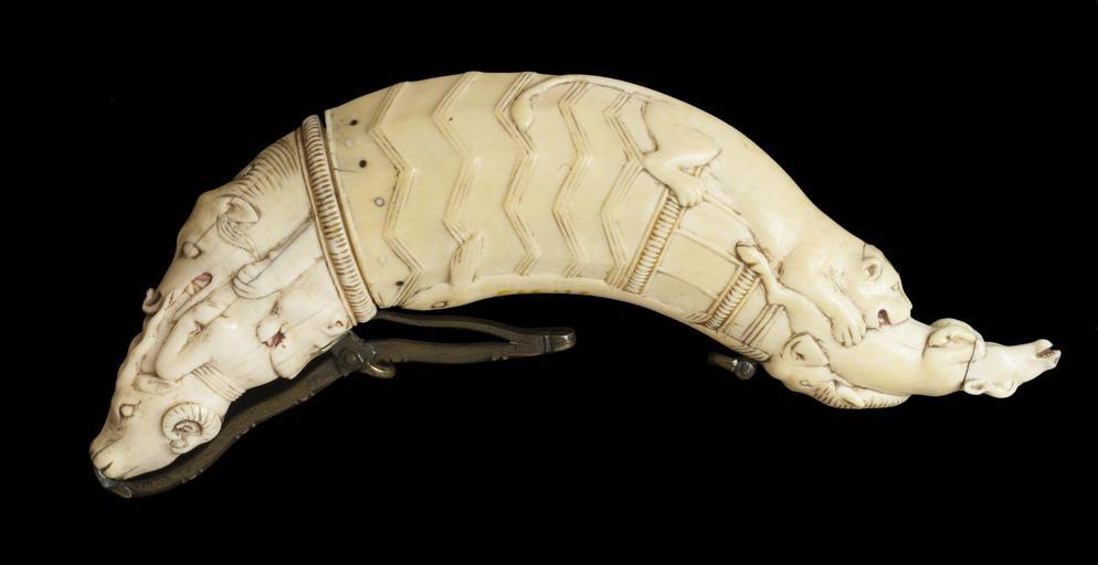 Keywords: Indian - Powder Flask - Walters 71419.jpg The powder flask also known as a priming flask was an essential firearm accessory and held the fine powder needed to make the gun fire Gunmakers in India during the Mughal era 1526-1858 specialized in carving ivory powder flasks with animal figures Often as these two examples the decoration consists of intertwined and composite creatures that seem to grow out of or attack one another One such menagerie on the right-hand flask includes a cheetah or lion chasing an antelope in the center and bucks antelopes lions birds a boar elephant and mongoose at the two ends Many of these animals were regularly hunted or used for hunts as with the elephant in Mughal India century 18 Early Modern ivory set with amber steel cm 6 2 16 2 2 5 accession number 71 419 40388 Max and Maurice Rosenheim date and mode of acquisition unknown Sale Sotheby's London May 9-11 1923 lot 304 Henry Walters Baltimore 1923 mode of acquisition unknown Walters Art Museum Henry Walters Acquired by Henry Walters 1923 place of origin India Walters Art Museum license Weapons in the Walters Art Museum Indian gunpowder flasks Mughal art in the Walters Art Museum Media contributed by the Walters Art Museum needs category review |