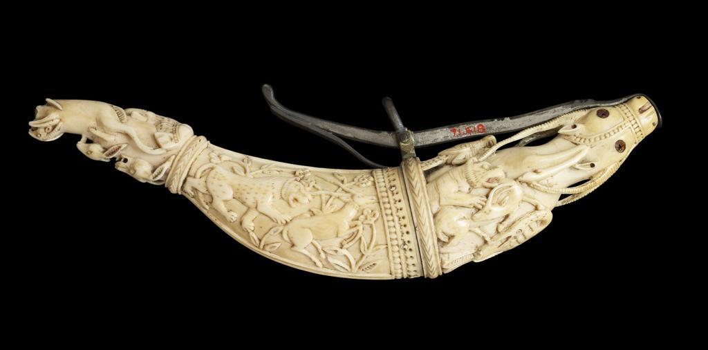 Keywords: Indian - Primer - Walters 71418.jpg The powder flask also known as a priming flask was an essential firearm accessory and held the fine powder needed to make the gun fire Gunmakers in India during the Mughal era 1526-1858 specialized in carving ivory powder flasks with animal figures Often as these two examples the decoration consists of intertwined and composite creatures that seem to grow out of or attack one another One such menagerie on the right-hand flask includes a cheetah or lion chasing an antelope in the center and bucks antelopes lions birds a boar elephant and mongoose at the two ends Many of these animals were regularly hunted or used for hunts as with the elephant in Mughal India 18th-1st half 19th century late Mughal ivory set with amber and steel; ivory steel cm 7 22 5 3 4 accession number 71 418 2698 Demotte Paris date and mode of acquisition unknown Henry Walters city Baltimore Walters Art Museum Henry Walters Acquired by Henry Walters 1925 place of origin India Walters Art Museum license Weapons in the Walters Art Museum Indian gunpowder flasks Mughal art in the Walters Art Museum Elephants in Islamic art |
