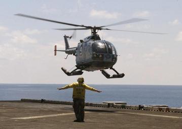 | Keywords: Indonesian Navy Bo 105 lands on USS Inchon (MCS-12) 2001.jpeg An Indonesian Navy MBB Bo 105 reconnaissance helicopter is guided to the flight deck of USS Inchon MCS-12 on 13 June 2001 The Indonesian Navy conducted deck landing qualification aboard the USS Inchon during the 1st Western Pacific Mine Countermeasures Exercise MCMEX 2001 MCMEX involved 14 countries in an effort to maintain safe navigation of international waterways by using mine hunting and disposal techniques of the participating navies Hosted by Singapore the exercise includes participants from Australia China France India Indonesia Japan Malaysia Papua New Guinea Russia Singapore South Korea Thailand United States and Vietnam http //www defenseimagery mil U S DefenseImagery photo VIRIN http //www defenseimagery mil/imagery html guid 0640e010a227495fa9e0d55fedac25b34966757c 010613-N-SN432-003 2001-06-13 U S Navy photo by PH3 Aaron L Lane PD-USGov-Military-Navy Aircraft of the Indonesian Navy Eurocopter Bo 105 USS Inchon LPH-12 |