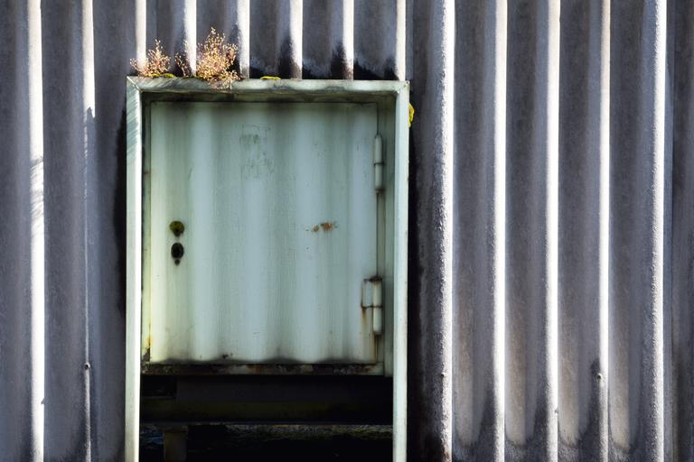 Keywords: industry factory graphically leave architecture building door old ruin stainless rusty metal roof overgrown moss schatte