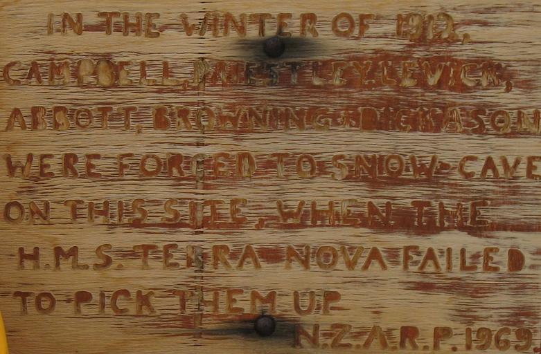 | Keywords: InexpressibleIsland5.JPG The sign marking the location of the Northern Party's ice hut on Inexpressible Island The Northern Party was part of Robert Falcon Scott's Terra Nova expedition 1910-1913 Own 2006-01-29 M Murphy Public domain HSM-14 1912 Terra Nova Expedition Plaques in Antarctica Inexpressible Island Antarctic historic sites and monuments |