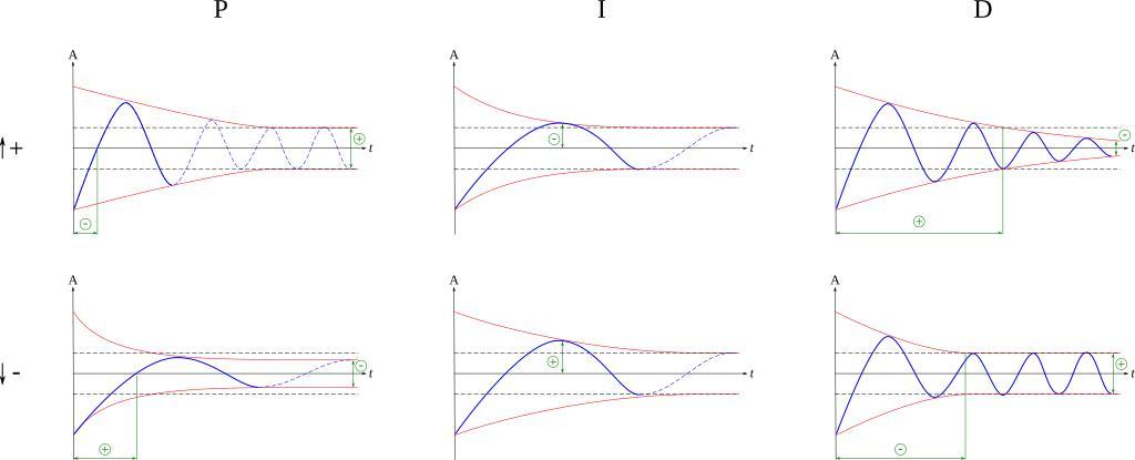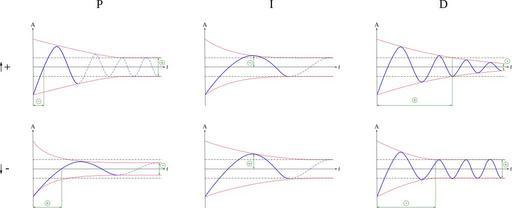 Keywords: Influence parametres PID.svg en Influence of the parameters on the convergence P high P fast the nominal value is reached early but not precise important oscilations around the nominal value low P slow the nominal value is reached late but precise few oscilations ; I high I slow but precise at the beginning the farthest value is quite close to the nominal value low I fast but not precise at the beginning the farthest value is quite away from the nominal value ; D high D slow it takes a long time until the values stay in the acceptable range but precise the range becomes narrow low D fast the value get fast in the acceptable range but not precise the range stays quite wide fr Influence des paramètres sur la convergence P P élevé rapide la valeur nominale est atteinte tôt mais imprécis oscilations importantes autour de la valeur nominale P faible lent le système met du temps à atteindre la valeur nominale mais péecis peu d'oscilations ; I I élevé lent mais précis au début la valeur la plus éloignée est relativement proche de la valeur nominale I faible rapide mais imprécis au début la valeur la plus éloignée est relativement éloignée de la valeur nominale ; D D élevé lent il faut un temps relativement long pour que les valeurs restent dans l'intervalle acceptable mais précis l'intervalle devient étroit D faible rapide les valeurs restent dans un l'intervalle acceptable au bout d'un temps relativement faible mais imprécis l'intervalle reste large 2012-07-17 own Cdang inkscape cdang cc-zero Uploaded with UploadWizard PID controllers |