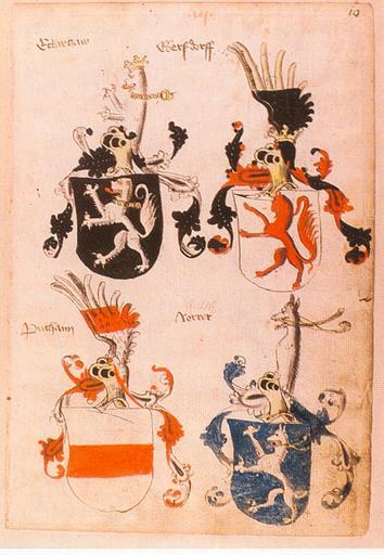 Keywords: Ingeram Codex 010.jpg Ingeram-Codex der ehemaligen Bibliothek Cotta <br/>Eckartzaw Eckartsau <br/> Eberßdorff <br/> Puchaim Puchheim <br/> Rerrer Die Wappenbücher Herzog Albrechts VI von Österreich Ingeram-Codex d ehem Bibliothek Cotta; hrsg v Charlotte Becher u Ortwin Gamber; Wien; Köln; Graz; 1986 Jahrbuch der Heraldisch-Genealogischen Gesellschaft Adler; Folge 3 Bd 12 Jg 1984/85; ISBN 3-205-05002-9 1459 Hans Ingeram and a so called Exempla-master Reproduction of a painting that is in the public domain because of its age PD-old-100 Ingeram - Österreichischer Adel Argent a fess gules Argent and gules in heraldry Coats of arms of Puchaim family Coats of arms of Ebersdorf family Eberssdorff Ingeram Codex Unicorns in Ingeram Codex 010 2 Eberssdorff |