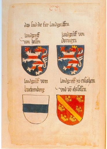 Keywords: Ingeram Codex 043.jpg Ingeram-Codex der ehemaligen Bibliothek Cotta <br/> XXj <br/> das sind die fier landgraffen <br/> landgreff/von hessen <br/> landgräff von/duringen <br/> landgräff vom/lewchtenberg <br/> landgreff zu ensishein und vo n elssessen Die Wappenbücher Herzog Albrechts VI von Österreich Ingeram-Codex d ehem Bibliothek Cotta; hrsg v Charlotte Becher u Ortwin Gamber; Wien; Köln; Graz; 1986 Jahrbuch der Heraldisch-Genealogischen Gesellschaft Adler; Folge 3 Bd 12 Jg 1984/85; ISBN 3-205-05002-9 1459 Hans Ingeram and a so called Exempla-master Reproduction of a painting that is in the public domain because of its age PD-old-100 Exempla Meister-Reichsverfassung Coats of arms of Alsace Former coats of arms of Hesse Coats of arms of Leuchtenberg family Former coats of arms of Thuringia Lions rampant barry of eight |