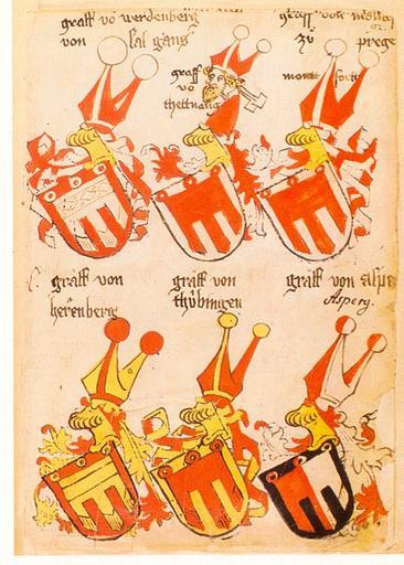 Keywords: Ingeram Codex 092.jpg Ingeram-Codex der ehemaligen Bibliothek Cotta <br/> graff vo n werdenberg/von Salgans <br/> graff vo n thettnang <br/> graff von monttf /zu Prege ns Montt/fortt <br/> gräff von/her r enberg <br/> gräff von thübingen <br/> gräff von asper/Asperg Die Wappenbücher Herzog Albrechts VI von Österreich Ingeram-Codex d ehem Bibliothek Cotta; hrsg v Charlotte Becher u Ortwin Gamber; Wien; Köln; Graz; 1986 Jahrbuch der Heraldisch-Genealogischen Gesellschaft Adler; Folge 3 Bd 12 Jg 1984/85; ISBN 3-205-05002-9 1459 Hans Ingeram and a so called Exempla-master Reproduction of a painting that is in the public domain because of its age PD-old-100 Ingeram Codex - Leitbracken Coats of arms of Werdenberg family Coats of arms from Tettnang Argent a gonfanon gules Coats of arms of Montfort Coats of arms of Herrenberg family Coats of arms of Tübingen Coats of arms of Asperg family Derivatives of the Coat of arms of Tübingen |