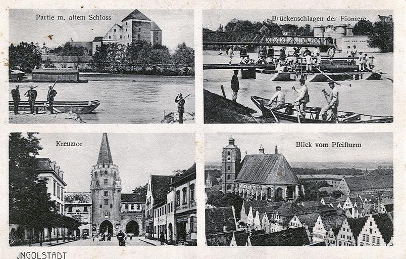 | Keywords: Ingolstadt - Sammelansicht 1.jpg Ingolstadt Postkarte mit vier Ansichten Oben links Donau mit Neuem Schloss Oben rechts Pioniere beim Brückenbau und Donautor Unten links Kreuzstraße und Kreuztor von Osten Unten rechts Blick vom Pfeifturm auf die Theresienstraße und das Münster Ingolstadt postcard with four views of the city Up left Danube river and New Castle Up right Sappers building a bridge in front of the Danube Gate Down left Kreuzstraße and Holy Cross Gate from east Down right View from Pfeifturm onto Theresienstraße and Minster of Our Blessed Lady Ingolstadt cartolina postale con quattro vedute della città In alto a sinistra Il Danubio con il Castello Nuovo In alto a destra Pionieri costruiscono un ponte davanti alla Porta del Danubio In basso a sinistra Veduta della Kreuzstraße con la Porta della Sta Croce da est In basso a destra La Theresienstraße e la Chiesa parrochiale della Nostra Signora viste dal Pfeifturm private collection of Wolfgang Sauber Xenophon ca 1915 Anonymous PD-1923 anonymous-EU Postcards of Ingolstadt Danube in Ingolstadt Donautor Ingolstadt Kreuzstraße Ingolstadt Kreuztor Ingolstadt Münster Zur Schönen Unserer Lieben Frau Ingolstadt Neues Schloss Ingolstadt Old military postcards of Germany Iron truss road bridges in Bavaria Bridges over the Danube in Germany Bridges in Ingolstadt |