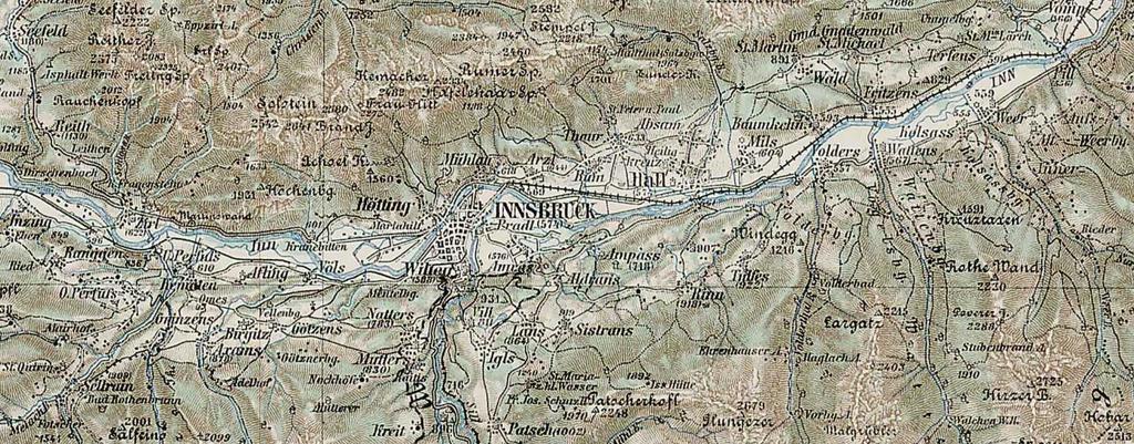 | Keywords: Innsbruck - 29-47 - Mittelgebirge um Innsbruck.jpg 3rd Military Mapping Survey of Austria-Hungary - Innsbruck; detail Southeast of Innsbruck http //lazarus elte hu/hun/moterkep htm - László ZENTAI Innsbruck - 29-47 jpg 50 1898/1905 Military mapping authority of Austria-Hungary 47 15 55 N 11 26 55 E cutout W B Innsbruck - 29-47 jpg PD-old Details from 3rd Military Mapping Survey of Austria-Hungary maps Old maps of Tyrol state Tiroler Mittelgebirge Old maps of Innsbruck Historical maps of the Inn watercourse system |