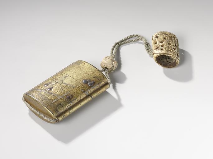 Keywords: Inro met kalebasplant, netsuke met feniks, ojime met jongen en maan-Rijksmuseum AK-MAK-1497.jpeg accession number AK-MAK-1497 Anonymous credit line GWToolset Rijksmuseum nl Inro met netsuke en ojime De vijfdelige inro is gedecoreerd met kalebasplanten in takamakie op een met goud besprenkelde ondergrond; de kalebassen gedeeltelijk in zilver en een hek in parelmoer zijn ingelegd De netsuke is gedecoreerd met een phoenix; de ojime is gesneden tot een klein jongetje dat naar de maan kijkt de netsuke en ojime zijn later toegevoegd Label Line Japan 18de eeuw hout lak ivoor goud zilver en Inro with netsuke and ojime The five-part inro is decorated with gourd plants in takamakie on a surface sprinkled with gold; the gourds partly in silver and a gate in pearl are inlaid The netsuke is decorated with a phoenix; the ojime is cut to a little boy who looks at the moon The netsuke and ojime added later inro Height cm 6 5 netsuke Height cm 3 6 ojime Diameter cm 1 5 exhibition history Institution Rijksmuseum lacquer ; wood ; bone ; mother of pearl ; gold ; silver object history Acquisition 1996 object type inro PD-US PD-old Data and photography rights All data and all images made available through the API are either in the public domain or are subject to a CC0 license https //www rijksmuseum nl/en/api/terms-and-conditions-of-use cc-zero place of creation Japan http //www rijksmuseum nl/collectie/AK-MAK-1497 http //hdl handle net/10934/RM0001 COLLECT 336542 handle Inro met kalebasplant netsuke met feniks ojime met jongen en maan Uploaded with GWToolset Rijksmuseum AK-MAK-1497 http //www rijksmuseum nl/media/assets/AK-MAK-1497 Images uploaded by Fæ Art of Japan in the Rijksmuseum Images from the Rijksmuseum Inro |