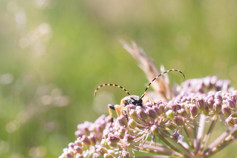 Keywords: insect flower beetle longhorn beetle pest close macro nature plant probe fauna summer pink flower bloom pointed flower wild flower meadow