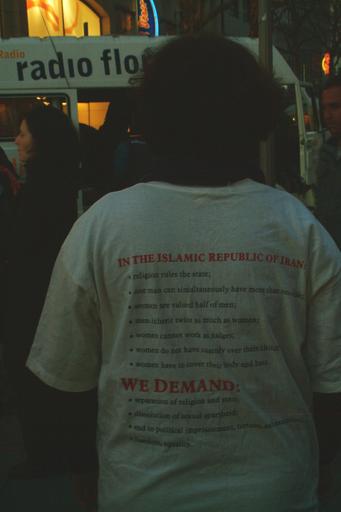 | Keywords: InterKoneXiones 2012 in Hannover T-Shirt In the Islamic Republic of Iran we demant.jpg T-Shirt anläßlich der InterKoneXiones 2012 in Hannover mit der Aufschrift IN THE ISLAMIC REPUBLIK OF IRAN religion rules the state; one man can simultaneously have more than one wife; men inherit twice as much as women; women cannot work as judges; women do not have custody over their child; women have to cover their body and hair WE DEMAND separation of religion and state; dissolution of sexual apartheid; end to political imprisonment torture and execution; freedom equality own 2012-03-24 19 40 53 Bernd Schwabe in Hannover PD-old Interkonexiones 2012 in Hannover Women wearing white T-shirts |