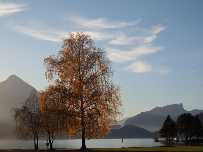 Keywords: interlaken lake lake thun bank promenade tree birch evening light blue hour mountains sneezing bernese oberland spiez thun hausberg switzerland