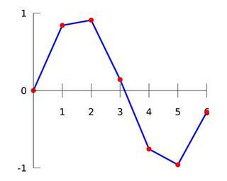 Keywords: Interpolation example linear.svg Illustration of linear interpolation on a data set The same data set is used for other interpolation methods in the interpolation article self-made in Gnuplot 2007-06-26 Berland Based on original PNG version by User Jitse Niesen with gnuplot source code and svg-version by User Cronholm144 Gnuplot source code set terminal svg fname Vera fsize 25 set output Interpolation_example_linear svg set key off set xzeroaxis set xtics axis 1 1 set ytics nomirror 1 set border 2 set samples 2 plot - with lines linetype 3 linewidth 4 \ - with points linetype 1 pointtype 7 pointsize 0 7 \ 0 with lines linetype -1 linewidth 1 0 0 1 0 8415 2 0 9093 3 0 1411 4 -0 7568 5 -0 9589 6 -0 2794 e 0 0 1 0 8415 2 0 9093 3 0 1411 4 -0 7568 5 -0 9589 6 -0 2794 e Interpolation |