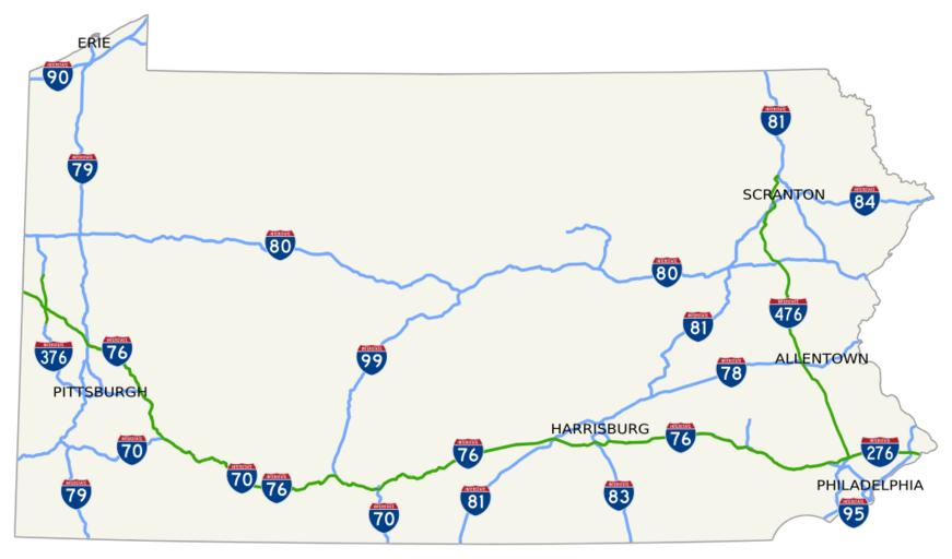 | Keywords: Interstates of Pennsylvania map.svg Map of all Interstate highways in Pennsylvania; toll roads in green and free Interstates in blue Based on File Pennsylvania Turnpike map svg public domain inkscape 2016-05-09 User Mr Matté/Author template Road maps of Pennsylvania Maps created by User Mr Matté |
