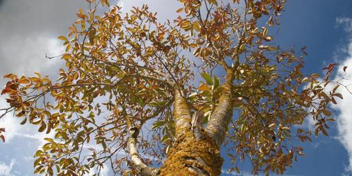 Keywords: into the sky leaves branches blue sky clouds tree blue trunk