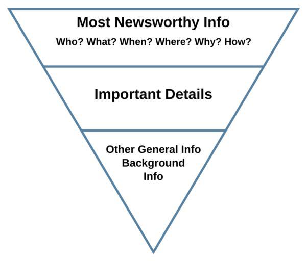 Keywords: Inverted pyramid.svg The Inverted pyramid technique of journalism writing Inverted_pyramid jpg 2011-01-24 09 00 UTC Inverted_pyramid jpg The Air Force Departmental Publishing Office AFDPO derivative work Makeemlighter Vector text versions Inverted pyramid 2 svg ; Translations Arabic Korean Redrawn as SVG Makeemlighter Inverted_pyramid jpg Original upload log This image is a derivative work of the following images File Inverted_pyramid jpg licensed with PD-USGov-Military-Air Force 2011-01-23T21 26 05Z P S Burton 718x569 31907 Bytes <nowiki> http //www shaw af mil/library/editorialpolicy submissions/newsarticles asp US Air Force Shawn Air Force Base 20th FW Editorial Policy Submission Guidelines Not given T</nowiki> Uploaded with derivativeFX Journalism