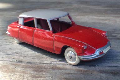 Keywords: This is not the wellknown Dinky Toys 24c Citroen DS. It's made by an unknown brand from Spain, named Invicta, in 1957. It is different from the Dinky, however it must be inspired on it. There is such a strong resemblance, but at least 41 spots can be found where it differs from the Dinky DS. It is from a genuine mould made by Invicta and definitely no copy. This is considered to be the rarest of all Citroen DS toys. To the day there are only 2 pieces known worldwide. Both in different colours. This one comes in a beautiful cherry red with beige roof. It's all original paint. This is the actual model of which (bad) pictures were used in magazines like 'L'Argus de la Miniature and Passion 43'.