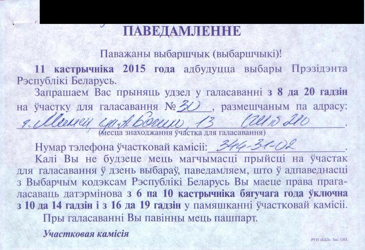 Keywords: Invitation to presidential election in Belarus (2015) - reverse.jpg en Official invitation to presidental elections in Belarus 2015 delivered by post reverse Private information is painted in black Translation from Belarusian Notification Dear voter voters On 11th October 2015 election of the president of the Republic of Belarus will take place We invite you to take part in the voting from 8 to 20 in the polling station No 30 which is situated at Minsk A Bačyly street 13 School No 210 address of the polling station Phone number of the local voting commission 344-31-02 If you can't vote on the polling day we inform that according to the Voting Codex of the Republic of Belarus you have a right to vote preliminary from 6th to 10th October of this year including the last day from 10 to 14 and from 16 to 19 in the local voting commission's premises You should have a passport during the voting Local voting commission be Афіцыйнае зап ашэнне на п эзідэнцкія выба ы ў Бела усі 2015 Зва отны бок Тэкст Паведамленне Паважаны выба шчык выба шчыкі 11 каст ычніка 2015 года адбудуцца выба ы П эзідэнта Рэспублікі Бела усь Зап ашаем Вас п ыняць удзел у галасаванні з 8 да 20 гадзін на ўчастку для галасавання 30 азмешчаным па ад асу г інск ул А Бачылы 13 СШ 210 месца знаходжання ўчастка для галасавання ума тэлефона ўчастковай камісіі 344-31-02 Калі Вы не будзеце мець магчымасці п ыйсці на ўчастак для галасавання ў дзень выба аў паведамляем што ў адпаведнасці з Выба чым кодэксам Рэспублікі Бела усь Вы маеце п ава п агаласаваць датэ мінова з 6 па 10 каст ычніка бягучага года ўключна з 10 да 14 гадзін і з 16 да 19 гадзін у памяшканні ўчастковай камісіі П ы галасаванні Вы павінны мець пашпа т Участковая камісія ru Официальное п иглашение на п езидентские выбо ы в Бела уси 2015 Об атная сто она Текст Уведомление Уважаемый изби атель изби атели 11 октяб я 2015 года п ойдут выбо ы п езидента Республики Бела усь П иглашаем Вас п инять участие в голосовании с 8 до 20 часов на участке для голосования 30 азмещённом по ад есу г инск ул А Бачило 13 СШ 210 местонахождение участка для голосования оме телефона изби ательной комиссии 344-31-02 Если Вы не будете иметь возможности п ийти на участок для голосования в день выбо ов уведомляем что в соответствии с Изби ательным Кодексом Республики Бела усь Вы имеете п аво п оголосовать дос очно с 6 по 10 октяб я текущего года включительно с 10 до 14 часов и с 16 до 19 часов в помещении изби ательной комиссии П и голосовании Вы должны иметь паспо т Участковая комиссия 2015-10-01 22 30 32 PD-textlogo PD-BY-exempt Homoatrox other versions 100px cc-by-sa-4 0 Uploaded with UploadWizard Voter invitation cards Presidential election of Belarus 2015 Cyrillic writing |