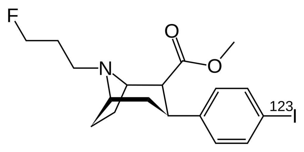 Keywords: Ioflupane (123I).svg Skeletal formula of ioflupane <sup>123</sup>I Created using http //www acdlabs com/download/chemsk html ACD/ChemSketch 10 0 and Inkscape Own 2007-11-23 Fvasconcellos 14 47 23 November 2007 UTC Organoiodides Radiopharmaceuticals Tropanes |