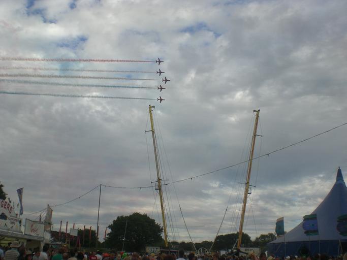 Keywords: IOW Festival 2009 Red Arrows.JPG Red Arrows performing at the Isle of Wight Festival in 2009 own Editor5807 2009-11-12 Isle of Wight Festival 2009 Aircraft formation flight of the Red Arrows BAE Hawk in the 2000s Images by Editor5807