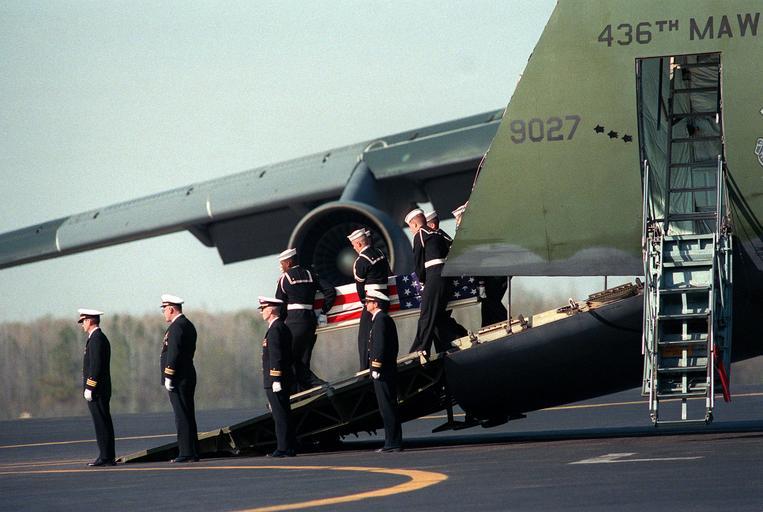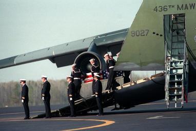 Keywords: IowaVictimsDover.jpg Descending from the nose of a C-5 Galaxy aircraft pallbearers carry the flag-draped casket of one of the 47 sailors who died when an explosion ripped through the No 2 16-inch gun turret of the battleship USS IOWA BB 61 Released to Public Location DOVER AIR FORCE BASE DELAWARE DE UNITED STATES OF AMERICA USA DoD photo by JOSN OSCAR SOSA Date Shot 20 Apr 1989 Source http //www defenselink mil/multimedia/ PD-USGov-Military-Navy Aboard USS Iowa BB-61 Dignified Transfers |