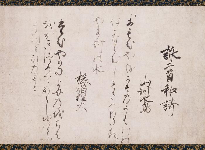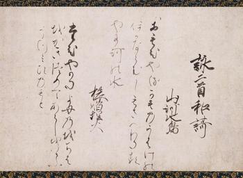 | Keywords: Ipponkyo kaishi - hanging scroll.jpg  Part of the Poems on the Chapters of the Lotus Sutra  品経懐紙 Ipponkyō kaishi collection of exemplary poets and calligraphy of the late Heian period The collection consists of 28 poems on the Lotus Sutra by as many poets ~ 1180 1183 ink paper Size cm 47 6 27 4 Institution Kyoto National Museum object history This poem by Saigyō was removed from the collection and mounted as hanging scroll The Ipponkyō kaishi album including this hanging scroll has been designated as National Treasure in the category writings accession number B甲1000 http //www emuseum jp/detail/101096/001/031 word d_lang en s_lang en class 2 title c_e region era cptype owner pos 1 num 2 mode detail century Emuseum PD-old-100 Ipponkyō kaishi Saigyō Kakemono |