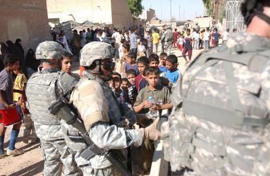 | Keywords: IPs, MND-B Soldiers conduct MedOp in Assyria DVIDS30945.jpg en CAMP TAJI Iraq Sgt Ervin Harris battalion nuclear biological and chemical non-commissioned officer Headquarters and Headquarters Battery 4th Battalion 42nd Field Artillery Regiment 1st Brigade Combat Team 4th Infantry Division hands water out to children from Assyria Village Sept 20 during a Community Health Outreach Program outside the Women's Center 2006-09-30 Spc Cal Turner https //www dvidshub net/image/30945 30945 2006-10-02 14 50 TAJI IQ PD-USGov Camp Taji Images from DoD uploaded by FĂŚ |