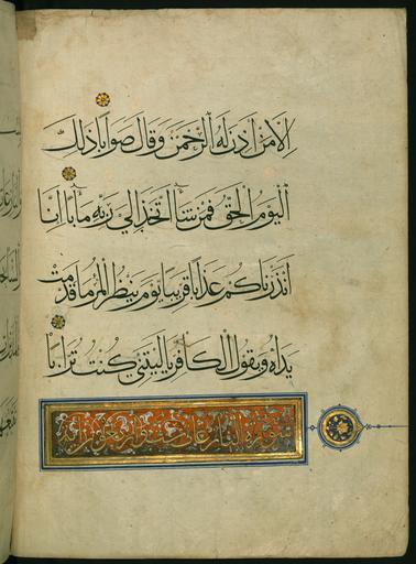 Keywords: Iranian - Illuminated Chapter Heading for Chapter 79 (Surat al-nazi'at) - Walters W5625B - Full Page.jpg This folio from Walters manuscript W 562 contains an illuminated panel on the bottom of the page that is the chapter heading for chapter 79 Surat al-nazi'at It is written in Thuluth script in gold ink on a red ground 9th century AH/AD 15th century Timurid ink pigments laid paper cm 38 28 accession number W 562 5B 81121 Henry Walters Baltimore date and mode of acquisition unknown Walters Art Museum Henry Walters Acquired by Henry Walters place of origin Iran Walters Art Museum license 2D Islamic manuscripts in the Walters Art Museum Art of Iran Media contributed by the Walters Art Museum needs category review |