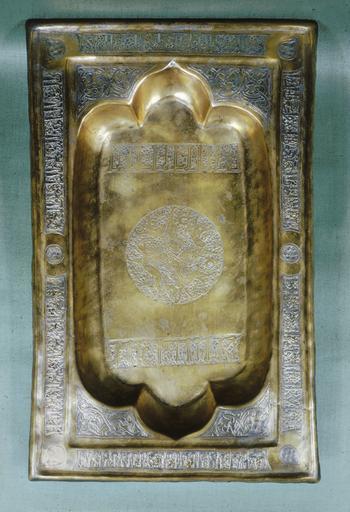 | Keywords: Iranian - Tray from a Small Serving Table - Walters 54530.jpg This small tray is decorated with arabesques and with Arabic inscriptions that bestow good wishes- including good fortune blessing wealth joy and happiness- on its owner late 12th-early 13th century Medieval brass silver and copper inlay cm 4 35 5 22 5 accession number 54 530 21788 Dikran Kelekian Paris Henry Walters city Baltimore Walters Art Museum Henry Walters Acquired by Henry Walters 1930 Translation Glory prosperity wealth happiness God's support entirety well-being Muhammad's intercession perpetuity sufficiency honor tranquility gratitude mastery victory victoriousness superiority elevation mercy ease health favor potency power God's sympathy safety charity long life and perpetual commendation to its owner Art of Persia Ithaca College Museum of Art Ithaca 1966-1967 The Arts of Islam Hayward Gallery London 1976 Islamic Insights Katonah Gallery Katonah 1980 place of origin Khorasan Iran Walters Art Museum license Islamic metalwork in the Walters Art Museum Art of Iran Media contributed by the Walters Art Museum needs category review |