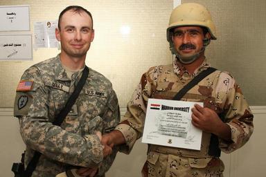 | Keywords: Iraqi Army soldiers learn lifesaving skills through Combat Life Saver course DVIDS110531.jpg  en Yusef Kareem Hashem Al Askary is presented a certificate for completing the Combat Life Saver course Aug 20 2008 by Staff Sgt Sean Kelly who serves with Company C Brigade Support Battalion Mongoose 2nd Stryker Brigade Combat Team 25th Infantry Division Multi-National Division “ Baghdad Yusef earned recognition as the honor graduate of his class which provides him an opportunity to move forward in the Iraqi army by being recommended for attendance at the IA medics' course 2008-08-23 Sgt Whitney Houston https //www dvidshub net/image/110531 110531 2008-08-24 13 25 BAGHDAD IQ PD-USGov 25th Infantry Division United States Images from DoD uploaded by Fæ |