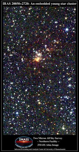 | Keywords: IRAS 20050+2720 (2MASS).jpg The embedded young star cluster IRAS 20050+2720 the bright agglomeration of stars near the center of the 2MASS three-color image This cluster has been recently studied by Chen et al 1997 ApJ 475 163 The cluster appears to consist of several subclusterings three of which were studied by Chen et al ; there appear to be several other subclusterings not included in their near-IR imaging The IRAS source itself is the brightest reddest southern subclustering Subcluster A Some reflection nebulosity is associated with the cluster stars Chen et al find an extinction to the cluster of AV ~ 10 although the extinction is clearly higher for subcluster A It is also clear from the 2MASS image that significant extinction is distributed throughout this field More than half of the point sources in the cluster appear to show an infrared excess beyond this extinction indicating that we may be seeing thermal dust emission from circumstellar disks around classical T Tauri stars These sources are therefore likely pre-main sequence objects Chen et al find that the slope and turnover of the K-band luminosity function imply an overall age for this cluster of ~1 Myr although the subclusters are of somewhat different ages The IRAS source subcluster A is also associated with dense molecular gas as traced by millimeter radio observations and coincides with the center of a multipolar outflow with a dynamical age of only 10<sup>3</sup> to 10<sup>4</sup> yr http //www ipac caltech edu/2mass/gallery/images_iras html 2MASS Atlas Image Gallery Various IRAS Sources Two Micron All Sky Survey 2MASS a joint project of the University of Massachusetts and the Infrared Processing and Analysis Center/California Institute of Technology funded by the National Aeronautics and Space Administration and the National Science Foundation 2MASS Atlas image 2MASS IRAS images |