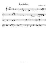 Keywords: Irmelin Rose.png Danish song composed by Carl Nielsen with text by J P Jacobson Lilypond <pre> <nowiki> include deutsch ly \version 2 6 4-5 \header title Irmelin Rose composer Carl Nielsen 1891 copyright Public domain melody \clef treble \time 4/4 \key a \minor \relative c' \partial 4 a'8 \markup unis a upbeat g4 f e d 1 c h a8 h c d 2 e4 e e fis8 gis \break 3 a2 r4 a8 \markup unis a 4 g4 f e d 5 c h a8 h c d \break 6 e4 e e fis8 gis 7 a2 r2 8 c8 d e4 a a 9 c8 d e4 a 2 \break 10 a8 h cis4 a8 gis fis e 11 a2 d 12 cis4 a8 cis h cis a gis 13 a4 r4 \bar 14 \score \new Staff \melody </nowiki> </pre> Also See Irmelin_Rose mid Find midi here Violin for beginners thumb 250px left Music Sheet <br style clear both; > PD-old Music of Denmark Compositions by Carl Nielsen |