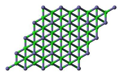 Keywords: Iron(II)-chloride-xtal-3D-balls-C.png Ball-and-stick model of part of the crystal structure of iron II chloride FeCl<sub>2</sub> X-ray crystallographic data from http //rruff geo arizona edu/AMS/download php id 10773 cif down text AMCSD originally from <small>R W G Wyckoff Crystal Structures 1 1963 Second edition Interscience Publishers New York 239-444 </small> Own 2009-03-05 Ben Mills Benjah-bmm27 Images by Ben Mills Crystal structure of iron II chloride |