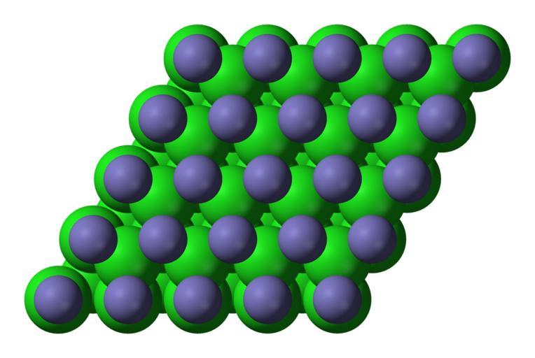 Keywords: Iron(II)-chloride-xtal-3D-SF-C.png Space-filling model of part of the crystal structure of iron II chloride FeCl<sub>2</sub> X-ray crystallographic data from http //rruff geo arizona edu/AMS/download php id 10773 cif down text AMCSD originally from <small>R W G Wyckoff Crystal Structures 1 1963 Second edition Interscience Publishers New York 239-444 </small> Own 2009-03-05 Ben Mills Benjah-bmm27 Images by Ben Mills Crystal structure of iron II chloride |