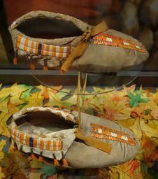 Keywords: Iroquois (probably) moccasins with quillwork, tin cones, and hair fringe, early 1700s - Bata Shoe Museum - DSC00653.JPG en Exhibit in the Bata Shoe Museum Toronto Ontario Canada This item is old enough so that its design is in the public domain The museum permitted photography without restriction 2013-07-04 11 35 41 own Daderot cc-zero Moccasins in the Bata Shoe Museum Uploaded with UploadWizard |