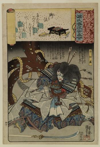 | Keywords: Iseya Ichibei - Genjigumo ukiyo-e awase - Walters 95104.jpg The great 12th-century general Taira no Tomomori ties himself to an anchor so that he may die by his own hand and not from enemy action as defeat nears in the famous sea battle at Dan-no-ura 1185 In The Tale of Genji as her death approaches Lady Murasaki insists on making the arrangements for her own funeral rites 1845-46 late Edo pigments mulberry paper cm 37 7 25 5 accession number 95 104 7131 Justine Lewis Keidel date and mode of acquisition unknown Walters Art Museum Gift of Justine Lewis Keidel 1986 Signature Ichiyusai Kuniyoshi ga; Transcription Genban ise-shi; Translation First published Ise city The Nature of Loyalty Japanese Warrior Prints of the Nineteenth Century The Walters Art Gallery Baltimore 1989 place of origin Edo present-day Tokyo Japan Walters Art Museum license 2D Japanese prints in the Walters Art Museum Historic samurai prints Media contributed by the Walters Art Museum needs category review Utagawa Kuniyoshi |